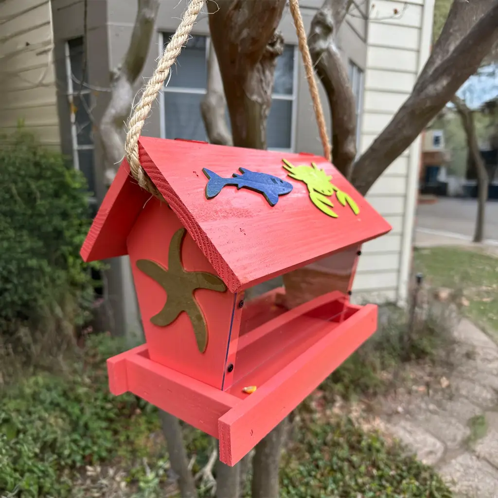 Handmade, wooden bird feeder with hinged top to load bird feed